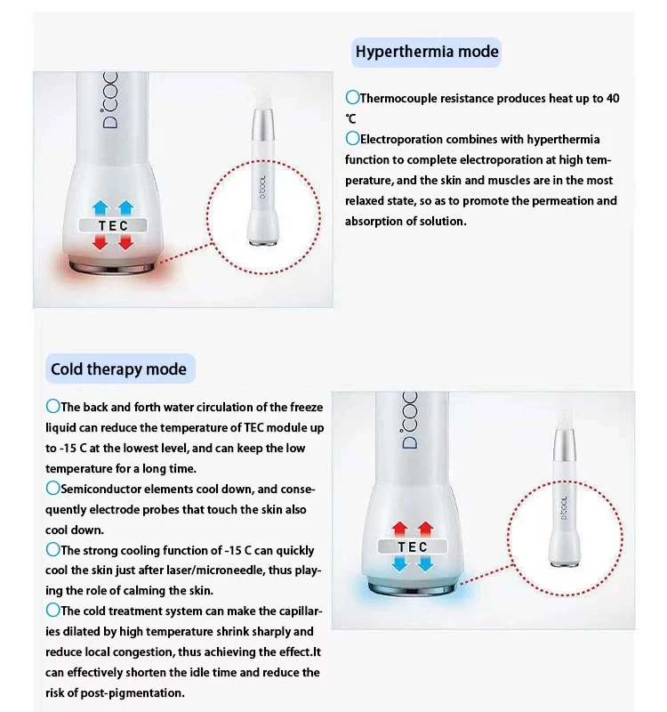 D-Cool is the top performer in post-care facial applications. It utilizes heat to open the pores, and electromagnetic forces to saturate the skin layer with nourishing solutions to accelerate healing and to rejuvenate the skin directly.
