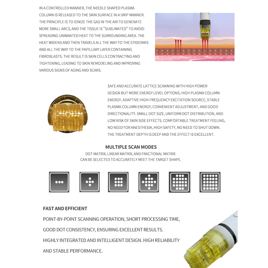 - Application de plasma fractionné: Cible des zones spécifiques de la peau avec précision, minimisant les temps d'arrêt et garantissant des résultats optimaux.
