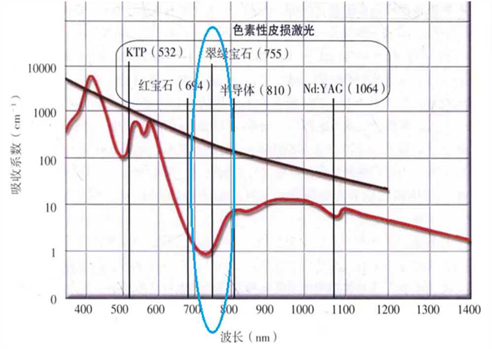 Berdasarkan spektrum penyerapan melanin, jelas bahwa melanin menyerap lebih banyak cahaya pada 755nm dibandingkan dengan 1064nm. Namun, kedalaman penetrasi laser 755nm di kulit secara signifikan lebih sedikit dari laser 1064nm.