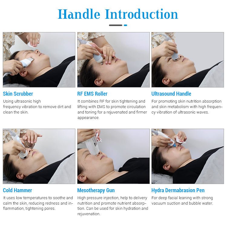 - Zes verschillende handgrepen: Bevat een waterdermabrasiebehuizing, huidwasser, mesotherapiepistool, RF -elektromagnetische rol, echografie en koude hamer.