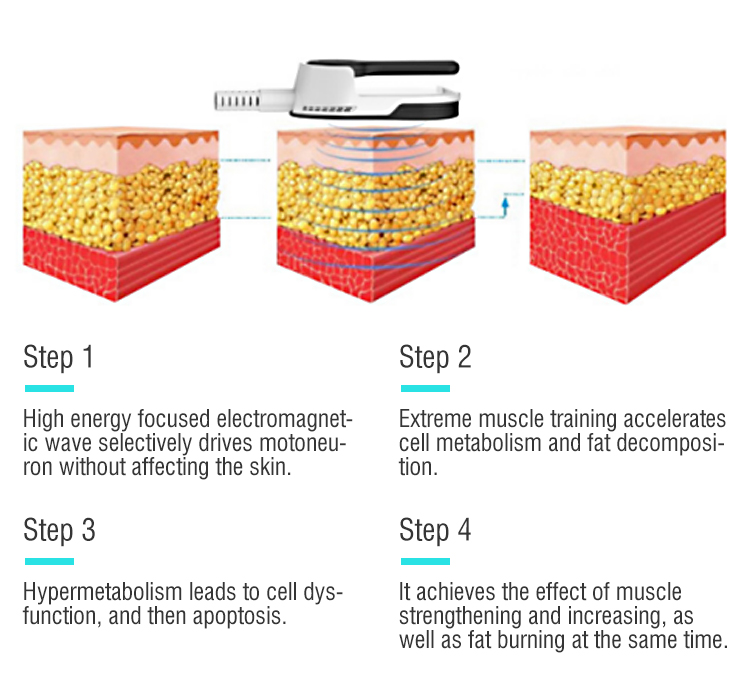The 100% extreme muscle contraction of HI-EMT technology can trigger a large amount of fat decomposition, Fatty acids are broken down from triglycerides and accumulated in fat cells. The concentrations of fatty acids are too high, causing the fat cells to apoptosis, which is excreted by the body’s normal metabolism within a few weeks. Therefore, slim beauty machines can strengthen and increase muscle, and reduce fat at the same time.