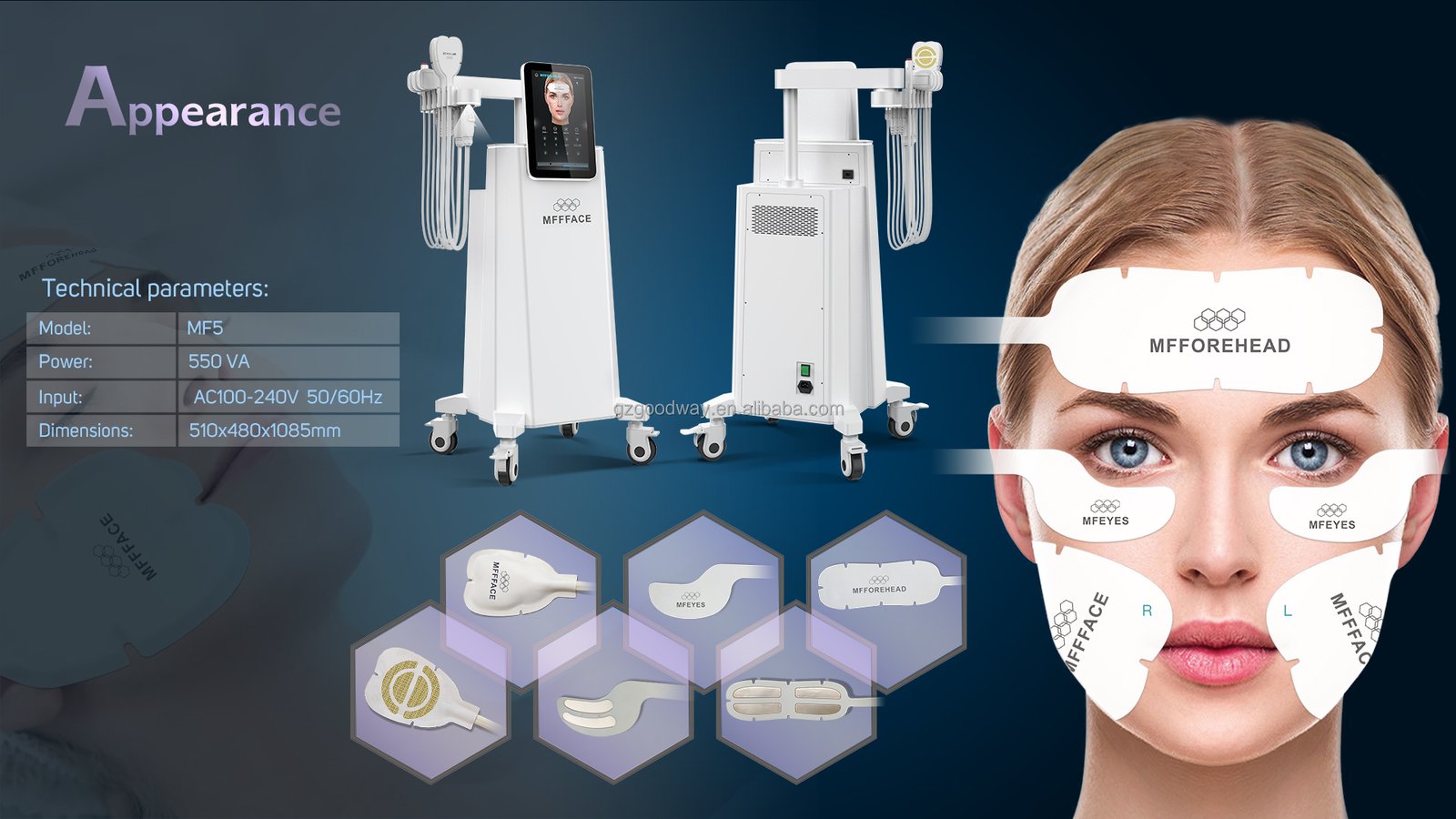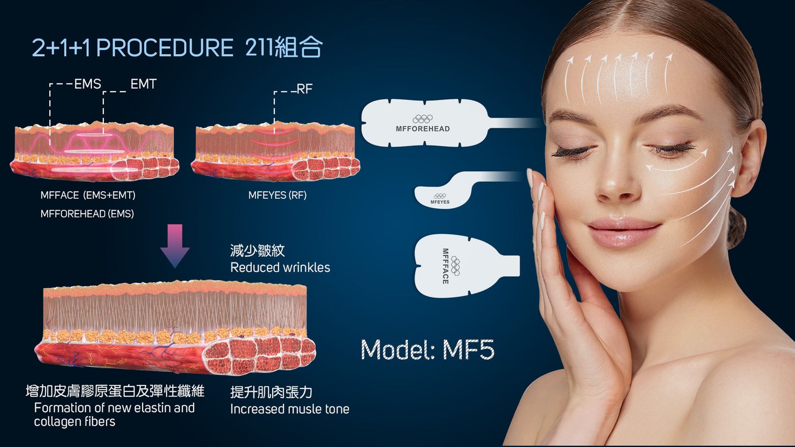 Electrical Muscle Stimulation (EMS), Electromagnetic Technology (EMT), and radiofrequency (RF) are all combined in this one face lift device. High-intensity magnetic pulses that are released by EMS and EMT technology can stimulate the muscles and cause them to contract selectively, elevating and tightening the skin. The dermis can be heated by RF heat radiation, and this increases collagen, which helps to restore skin suppleness and reduce wrinkles.