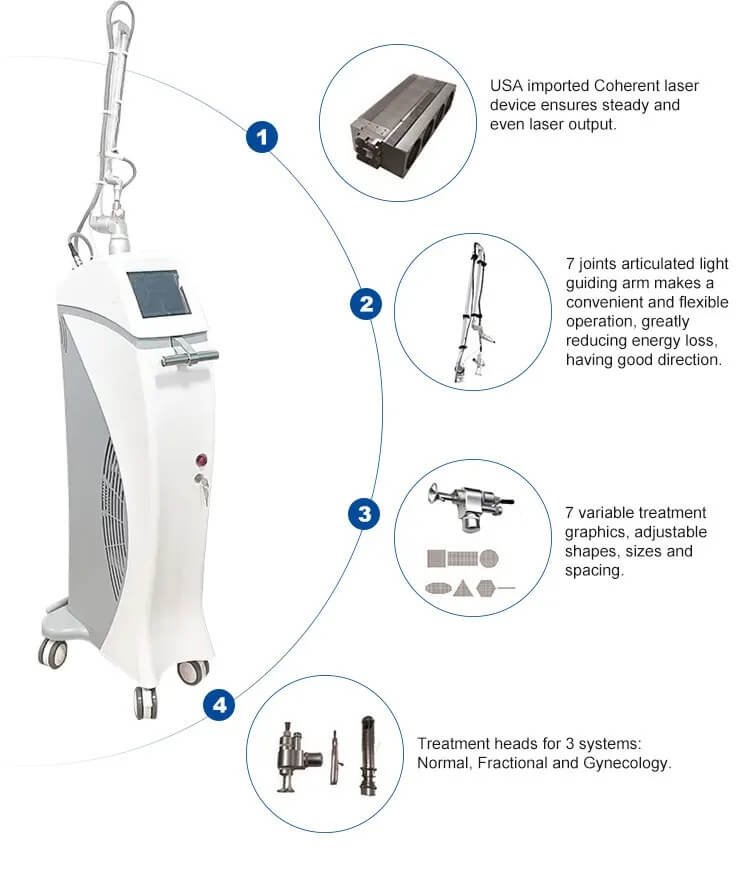 A4: CO2 Fractional laser is the most advanced conceptual fractional CO2 skin peeling laser system with a wavelength of 10600nm. In addition to its fine skin-peeling effect, it can effectively penetrate the laser beam into the dermis. It is the most beneficial skin recovery system and can achieve the long-term effect of collagen remodeling as well as the improvement of aged skin conditions due to exposure to light.